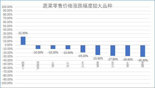 一、蔬菜市场价格继续走低 上周,根据商务部生活必需品市场监测系统平台数据显示,重点监测的30种蔬菜“7涨17跌6平”,蔬菜零售均价环比上周下降6%,蔬菜价格继续走低。其中,胡萝卜1个品种涨幅超过10%;莲藕、生菜、苦瓜、菠菜、冬瓜、山药、大葱、西葫芦8个品种跌幅超过10%;圆白菜、生姜、莴笋、豆芽、辣椒、洋葱6个品种蔬菜价格环比基本持平。上周天气良好,市场蔬菜供应充足,蔬菜价格继续下行。