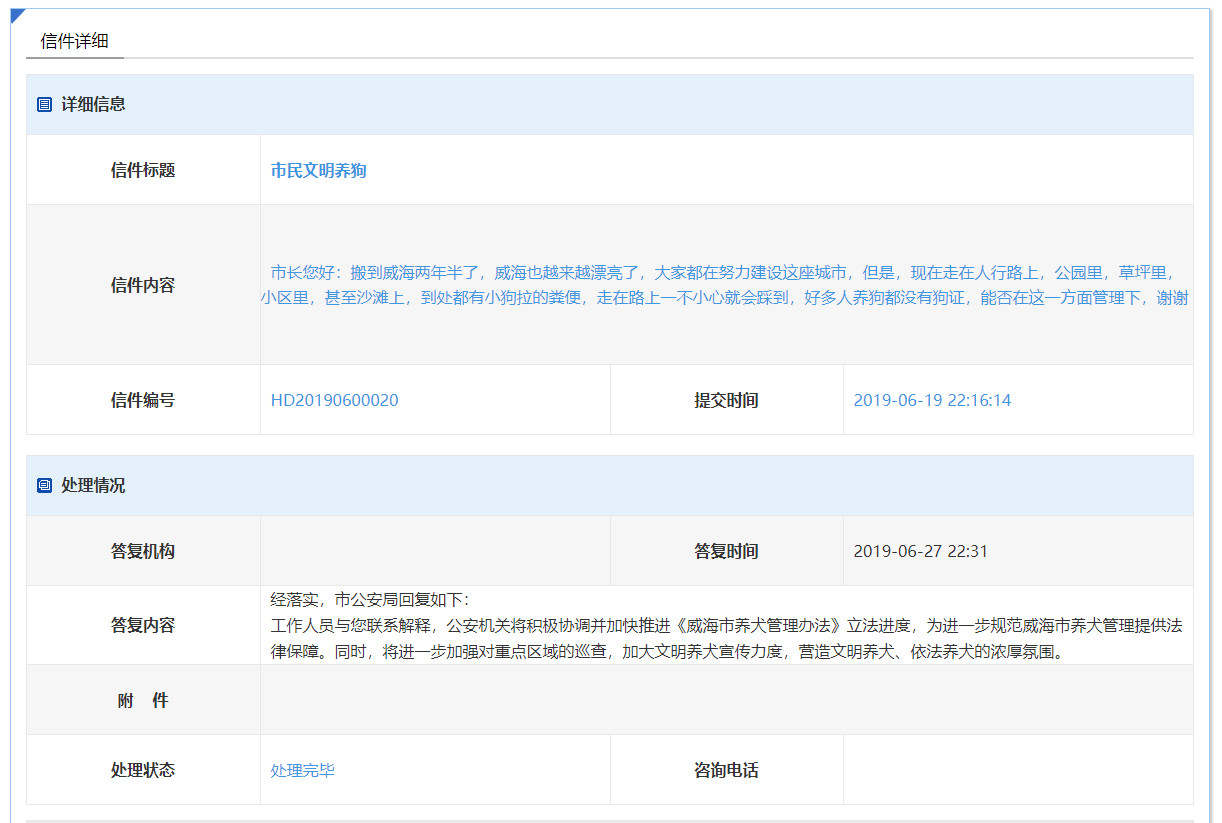 点击信件,会得到相关办理单位部门的答复意见,详情页面如下图所示。