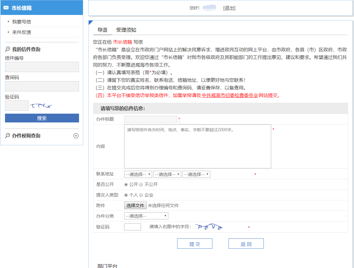 “市长信箱”是设立在市政府门户网站上的解决民意诉求,增进政民互动的网上平台,由市政府、各县(市)区政府、市政府各部门负责受理。欢迎您通过“市长信箱”对我市各级政府及其职能部门的工作提出意见、建议和要求。本平台不接受信访举报类信件,网上举报请至中共威海市纪委监委举报网站(http://shandong.12388.gov.cn/weihai/)提交,网上信访请至威海市网上信访受理平台(http://whsxfj.gov.cn/login)提交。